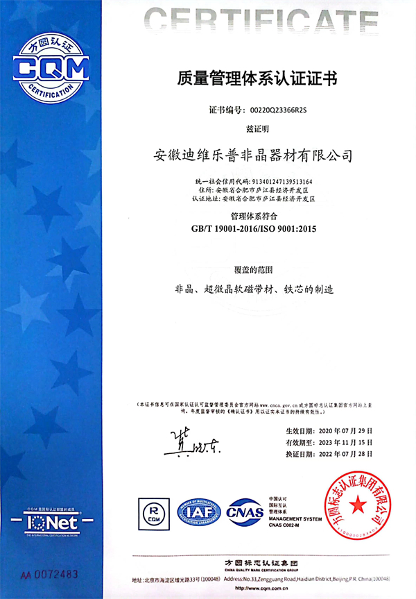 為響應(yīng)國家標準化發(fā)展綱要,推動高質(zhì)量發(fā)展,建設(shè)社會主義現(xiàn)代化國家。 安徽迪維樂普非晶器材有限公司、非晶合金電力互感器材料研究中心;為促進標 準化發(fā)展、提升標準化水平;實現(xiàn)企業(yè)有序發(fā)展、有規(guī)可循;產(chǎn)品質(zhì)量有據(jù)可依、 方便客戶甄別選用,特制定本企業(yè)質(zhì)量標準。